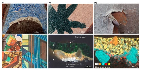 In Portugal, Almada Negreiros, although considered a fresco revivalist, was also experimenting, as shown by the discovery of red and yellow cadmium pigments and the green organo-synthetic pigment PG8, in his fresco production of 1939 and 1945 [,,]. In the set of paintings realised in 1949 at the maritime station of Rocha do Conde de Óbidos, he seems to have taken a step forward. This paper focuses on the scientific survey carried out on the six murals using visible and raking light examinations with further imaging and analytical instrumentation on the specific paintings named P1, P3, and P6 (Figure 1). These murals are supposedly the first, the third, and the last to be painted, hinting at how the work evolved. An in-depth study of the colour palette and organic materials present in the paint layers is beyond the scope of this paper and will be the subject of the second part of the research.