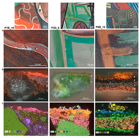 From top to bottom, (a) details and macrophotography of the sampling places of samples P1B_10, P3D_6, and P6B_12; (b) OM-vis 200× of the paint layers cross-sections with the indication of the number of layers identified; (c) SEM-EDS elemental maps of the paint layers revealing the presence of Ca-, Fe-, Cd-Se-, and Cu-As-based pigments. The stratigraphic description of the paint layers and SEM-EDS data are reported in Table 2.