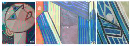 Almada painted fast and with confidence and only seemed to leave for the next day the layers of paint and final black outlines that spanned over two (or more) patches of plaster. This procedure not only ensured the colour uniformity of the figuration/motifs carried out on different working days but also disguised the mortar joins, guaranteeing the visual continuity of the paint work (Figure 12). This work method is visible in P1, and particularly in P3, on the faces of the figures in the upper half of the composition (Figure 12a). In mural P6, there seem to have been exceptions in this regard that were left visible (Figure 12b). Moreover, changes were made to the composition during the painting work, and several drops of paint are also visible on the paint surface, sometimes poorly disguised (Figure 12c). Another difference found in P6 was the lack of transparent and semi-transparent paint layers compared to P1 and P3. The simultaneous use of fluid and more opaque brushstrokes creates optical differences and effects that visually enrich the composition. In P6, the paint layers are mostly opaque and rather thick, from the backgrounds to the final touches, giving the impression that Almada ran out of time and had to speed up the painting execution.