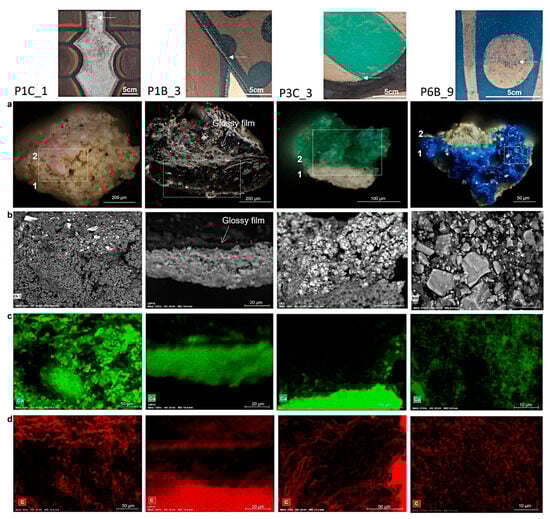 From top to bottom, (a) Image details of the sampling places of samples P1C_1, P1B_3, P3C_3 and P6B_9 and OM-vis 400× of the paint layers, with the indication of the number of layers identified; (b) SEM backscattered images of the paint layers and constituents; (c,d) SEM-EDS elemental maps distribution of calcium (in green) and carbon (in red) confirming the presence of both elements in the paint structure. Stratigraphic description of the paint layers and SEM-EDS data are reported in Table 2.