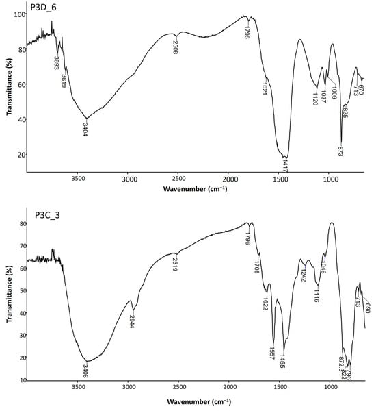 On top, FTIR spectrum of the green layer of sample P3D6. The absorptions in the spectrum allowed the identification of kaolin group minerals (3693, 3619, 1037, 1009 cm−1), calcium sulphate dihydrate (3404, 1621, 1120, 670 cm−1), and calcium carbonate (2508, 1796, 1417, 873, 713 cm−1). The band at 825 cm−1 may be assigned to AsO or CrO elongations. On the bottom, FTIR spectrum of the green layer of sample P3C3. The absorptions in the spectrum allowed the identification of calcium sulphate dehydrate (3406, 1622, 1116 cm−1), calcium carbonate (2519, 1796, 1455, 873 and 714 cm−1), polyvinyl alcohol (2944, 1708, 1242 cm−1), silicates (1046 and 690 cm−1) and emerald green (1557, 1455, 822, 796 cm−1).