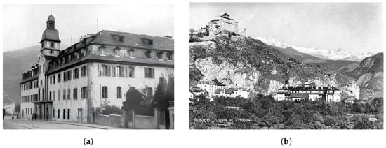 Historical photos of the old hospital of Sion [20]. (a) The hospital as photographed in the 1920s. (b) The situation of the hospital in the town of Sion (building with the bell tower on the bottom right).
