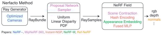 - Tancik, M.; Weber, E.; Ng, E.; Li, R.; Yi, B.; Wang, T.; Kristoffersen, A.; Austin, J.; Salahi, K.; Ahuja, A.; et al. Nerfstudio: A Modular Framework for Neural Radiance Field Development. In Proceedings of the Special Interest Group on Computer Graphics and Interactive Techniques Conference Conference Proceedings, SIGGRAPH ’23, Los Angeles, CA, USA, 6–10 August 2023. [Google Scholar] [CrossRef]