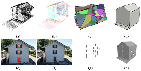 Automatic generation of LOD3 models using Pantoja-Rosero et al. [1] framework. (a) Point cloud generated with structure-from-motion; (b) clustered point cloud in planar primitives; (c) candidate faces produced by the intersection of planar primitives; (d) LOD2 model; (e) semantic segmentation of openings; (f) 2D coordinates of opening corners inferred from semantic segmentation; (g) 3D openings projecting 2D corner coordinates with camera poses; (h) LOD3 model merging LOD2 model and openings.