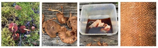 Sweden’s diverse flora and climatic conditions have endowed it with a rich variety of mushrooms, which have been used in various applications. Mushrooms contain essential minerals such as calcium, iron, phosphorus, potassium, and copper, which play a crucial role in natural dyeing by acting as fixatives that help the dye adhere to fibres, particularly iron and copper [27]. While the use of mushrooms for dyeing is a relatively recent practice in Sweden compared to the historical use of lichens in the eighteenth and nineteenth centuries, recently there has been a resurgence of interest in using mushrooms for dyeing wool and other natural fibres, owing to the relatively straightforward dyeing process [24].
