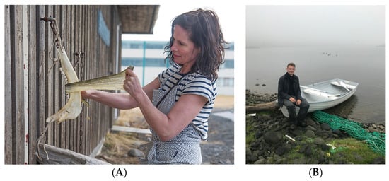 (A) Katrín María Káradóttir from Iceland University of the Arts tanning fish skins and her student (B) Sigmundur Páll Freysteinsson picking up salted shield lichen (Parmelia saxatilis) in Langanes, Iceland.