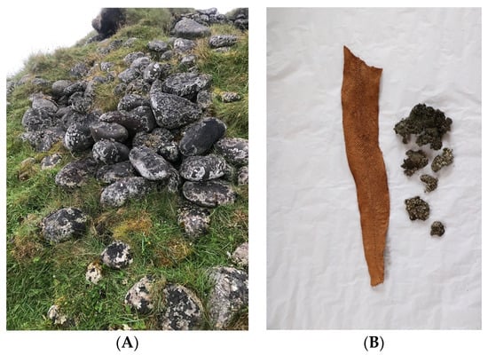 For Katrín María Káradóttir, the process of exploring seaweed for natural dyeing began with foraging on the coast near her home where she collected various types of algae, including dulse (Palmaria palmata) and toothed wrack (Fucus serratus) (Figure 13A).