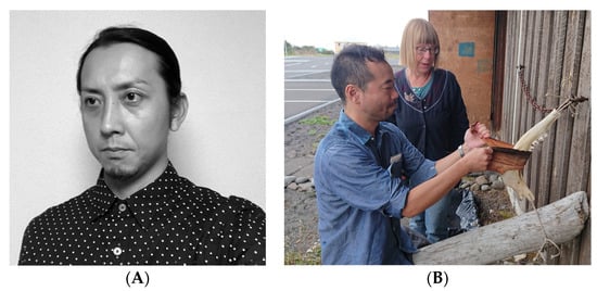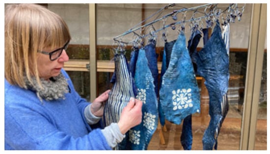 Awa indigo dyeing has been preserved and passed down through generations by indigo masters. Lotta Rahme (Figure 21), and Elisa Palomino (Figure 22A), a research associate at the Smithsonian Arctic Studies Center and principal investigator of the Horizon 2020 FishSkin project at Central Saint Martins, University of the Arts, London, have teamed up with Takayuki Ishii (Figure 22A), a master indigo dyer working in the Fujino mountains in Japan, to create a new range of fish skin shades using traditional Japanese indigo.