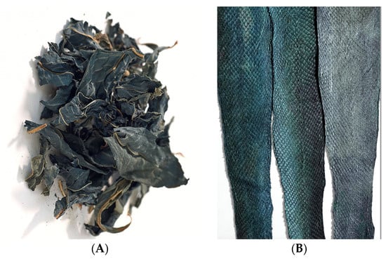 (A) Scutellaria baicalensis. (B) Salmon skins dyed with Scutellaria baicalensis.
