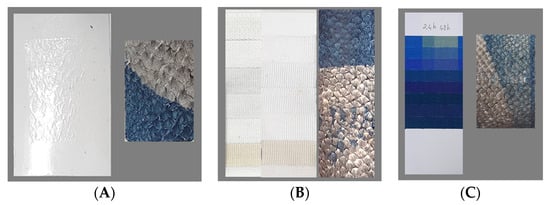 ISO 105-B02:2014 Textiles—Tests for colour fastness—Part B02: Colour fastness to artificial light: Xenon arc fading lamp test [48]: This test emulates the weathering of a colour sample by exposition to natural solar light. In this case, samples’ colour fading is rated against a blue scale on fabrics representing values 1 to 8, where 8 is the highest standard. The lightfastness obtained for the indigo-dyed fish skins (Figure 24C) was 2, which was a very weak result. Fish skins dyed with toothed wrack (Fucus serratus) scored 3. Fish skins dyed with rakkudai scored 3/4, those dyed with Scutellaria scored 3, and those dyed with sapanwood scored an even lower value (1). When using these dyes, it is recommended to avoid direct sunlight. However, fish skins tanned with gallnut and dyed with beard lichen (Usnea dasopoga) scored a remarkable 8 and those dyed with horsehair lichen (Bryoria capillaris.) scored 7. Fish skins tanned with gallnut and dyed with roots from tormentil (Potentilla erecta) scored 7.