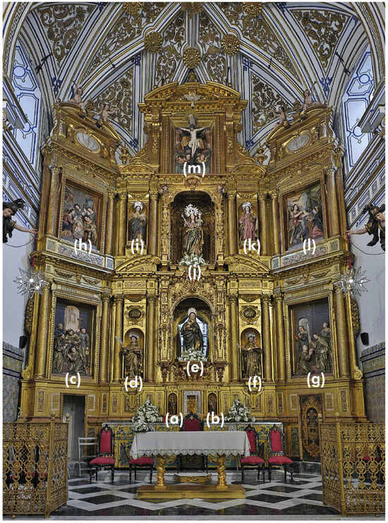 This work focuses on studying the main altarpiece that presides over the church of Santa Clara in Seville (Spain), see Figure 1. For its creation, Martínez Montañés was commissioned in 1621, who took charge of its design and carving. However, in 1722, the altarpiece underwent a renovation, during which a relief depicting Saint Clare (Santa Clara) among the nuns of her community was removed and replaced by a shrine, altering the original composition of the work. This mannerist-style altarpiece adapts to the polygonal apse of the church and is structured into two bodies and an attic. The first body features two reliefs depicting scenes from the life of Saint Clare: “The imposition of the habit on Saint Clare by Saint Francis” and “The miraculous blessing of bread”. These reliefs flank the central shrine housing the image of “Saint Clare”, between which are the sculptures of “Saint Bonaventure” and “Saint Anthony of Padua with the Child in his hands”. At the ends of the second body, two reliefs portray scenes of the “Nativity of the Lord” and the “Annunciation”, while the central aisle is presided over by the image of the “Virgin of the Rosary”, attributed to Francisco de Ocampo and dated around 1633. Flanking this central image are the sculptures of “Saint Agnes” and “Saint Mary Magdalene”. The attic is occupied by a representation of the “Holy Trinity”, following the post-Tridentine iconography of the Throne of Grace. Finally, on the altarpiece’s predella, on the sides of the tabernacle, are two small sculptures of “Saint Peter”, possibly crafted by Alonso Cano, and “Saint Paul”.