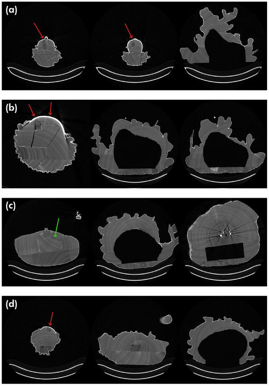 Cross-sections of the sculptures: (a) Saint Mary Magdalene, (b) Saint Anthony of Padua, (c) Saint Bonaventure, and (d) Saint Agnes. From left to right, the cuts are made from the head to the feet of the sculpture. The red arrows indicate the inserted pieces of wood and the green arrow the piece where the head is carved.