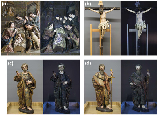 Photograph and UV images: (a) Nativity of the Lord; (b) Christ Crucified; (c) Saint Paul; (d) Saint Peter.
