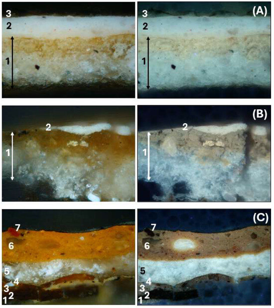 Samples cross-sections analysed by OM: (A) Virgin’s flesh tone near the garment, (B) angel’s flesh tone near the garment, (C) golden area. The right column shows the images obtained under UV illumination and the numbers indicate the different layers.