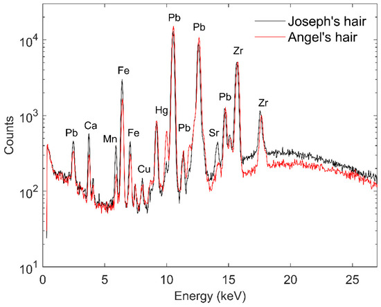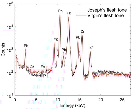 The hair of the figures presents a variety of brown tones achieved through the combination of ochre, umber, vermilion, and quite possibly a copper-based green; green was often added to hair colour mixtures [30]. For the darker hue, there is an increase in the amount of umber (from 2.7 ± 0.2 cps to 8.7 ± 0.3 cps of Mn) and ochre (from 42.9 ± 0.5 cps to 72.7 ± 0.6 cps of Fe), accompanied by a decrease in vermilion (from 32.6 ± 0.5 cps to 8.8 ± 0.3 cps of Hg). However, the quantity of lead white remains relatively stable, likely originating from the primer, as illustrated in Figure 6. Additionally, Zr peaks originate from the detector’s collimator and remain consistently present across all measurements, while Sr peaks typically appear alongside high Ca presence, suggesting a calcium-based primer impurity [31]. The intensity of the Sr peaks varies in relation to the intensity of the Ca peaks. In Saint Joseph’s hair, which presents the darkest brown tone, the highest peaks of Ca were observed throughout the relief, suggesting the potential use of bone black, which offered more excellent opacity compared to other pigments used at the time [32]. Unfortunately, confirmation of its usage via phosphorus detection is not feasible, as this region of the spectrum is affected by the M-Pb peaks and electronic noise, and no sample could be taken for SEM-EDX analysis.