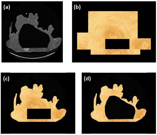 Montañés was knowledgeable about all these issues regarding the behaviour of wood, which allowed for him to apply preventive measures and different compositions in the joint to prevent future damage to his sculptures. Figure 2 shows different cross-sections of several sculptures: Saint Mary Magdalene (a), Saint Anthony of Padua (b), Saint Bonaventure (c), and Saint Agnes (d). In the images corresponding to the heads, it can be clearly observed how the artist identifies areas affected by natural checks and replaces them with other pieces of wood devoid of such problems. In this way, Montañés mitigates the risk of cracks expanding outward over time due to the natural movements of this material. Moreover, the inserted pieces of wood were skilfully fashioned into dovetail (trapezoid) shapes to prevent the expulsion of these grafts under pressure.