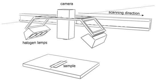 The measurement was carried out using an imaging system with short wavelength infrared reflectance spectroscopy (SWIR 1000–2500 nm, 256 spectral channels, spectral resolution 6.32 nm; Specim, Oulu FIN, https://www.specim.com/products/swir/; accessed on 22 July 2024). The system is equipped with six-point halogen light sources arranged symmetrically on both sides of the camera at an angle of 45° [46]. The scanning system was positioned in vertical geometry (Figure 1). The scan parameters were different for each scan to obtain good-quality images: exposure time 3.3–4.8 ms, repetition frequency 9 Hz, and camera movement speed 1.31–4.9 mm/s. The obtained hyperspectral images were normalized to the white (Spectralon white plate, Labsphere, North Sutton, NH, USA, https://www.labsphere.com/product/spectralon-reflectance-targets/; accessed on 22 July 2024) and reduced with dark current. Reference and dark current measurements were taken using the same parameters as for the actual object’s measurements. Fourteen scans were performed, which were then cropped and stitched using the Scale Invariant Feature Transform (SIFT) algorithm [47]. The final image was segmented to eliminate glossy areas (signal saturation), areas where it was not possible to achieve adequate sharpness to obtain high-quality spectra, and to remove background and signals not related to amber (e.g., ivory plaques areas). Data analysis was performed using self-developed scripts written in Python (Python Software Foundation. Python Language Reference, version 3.11.7).