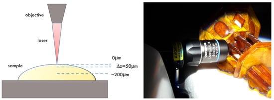 Raman depth profiling was also performed (Figure 2). Scans were collected from the surface (0 μm) to a depth of −200 μm, with a step of 50 μm, giving five spectra for a single depth profiling. The zero level was defined at the optical focus point. Every spectrum was collected using an accumulation of 100 scans with an accumulation time of 1 s. Spectra were collected in the range 750–1850 cm−1. The spectra were preprocessed before analysis using the WiRE 5.2 software (Renishaw, UK). The cosmic rays were removed, and a smoothing procedure was applied. Then, a background correction that uses an intelligent polynomial algorithm was used.