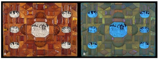 Amber plaque—analytical images: (A) under visible light, including Raman and XRF measurement sites (yellow numbers) and (B) UV-induced fluorescence.