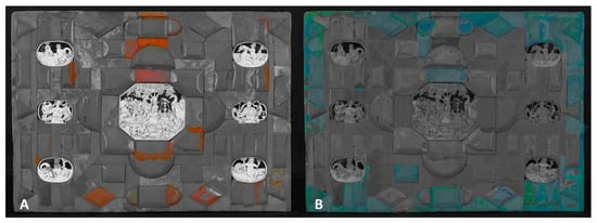 Amber casket—front: (A) map of the location of amber based on the Golloch’s coefficients [Equation (1)]. Orange areas are places where both coefficients did not exceed amber characteristic values; blue areas are where coefficient values exceeded the range of amber reference. Arrow indicates the place where, thanks to UV images, shellac was identified. (B) Map of the location of synthetic resin (1) (green areas), nitrocellulose mass (blue areas), and their simultaneous presence (red areas).