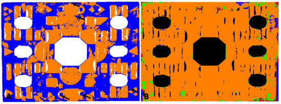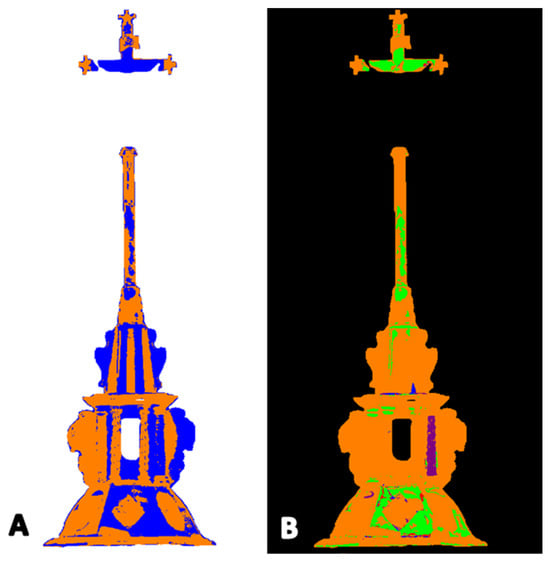 Amber crucifix: (A) map of the location of amber based on the Golloch’s coefficients [Equation (1)]. Orange areas are places where both coefficients did not exceed amber characteristic values; blue areas are where coefficient values exceeded the range of amber reference. (B) Map of the location of synthetic resin (1) (green areas), synthetic resin (2) (purple areas), nitrocellulose mass (blue areas), and simultaneous presence of synthetic resin (1) and nitrocellulose mass (red areas).