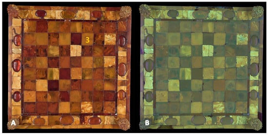 Upon inspection of the images of the chessboard (Figure 6), no different colors were observed, indicating the presence of materials characterized by fluorescence under UV radiation. In this case, UV images can be misleading due to the very slight fluorescence of the varnish present on the surface. This was revealed through the Raman measurements discussed below.