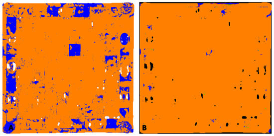 Chessboard: (A) map of the location of amber based on the Golloch’s coefficients [Equation (1)]. Orange areas are places where both coefficients did not exceed amber characteristic values; blue areas are where coefficient values exceeded the range of amber reference. (B) Map of the location of nitrocellulose mass (blue areas).
