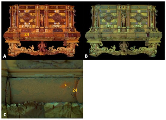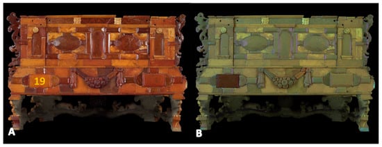 Technical photography was used to document a cabinet and a crucifix, encompassing visible light (VIS) and ultraviolet-induced fluorescence (UV). Images were recorded in JPG, RAW, and TIF formats. Visible light photography (VIS) was carried out using a Canon EOS 5D Mark III camera with a Canon Macro EF 100 mm, 1:2.8. USM lens, under halogen illumination (two columns with 2 × 125 + 2 × 150 W), with exposure parameters set to 1/2 s; f/16; ISO 100. Ultraviolet-induced fluorescence (UVIF) photography involved using a Canon EOS 5D Mark III camera with the Canon Macro EF 100 mm, 1:2.8. USM lens. Images were captured using 4 × Philips TL-D 36W/BLB UV fluorescent lamps (368 nm), with exposure parameters set to 60.0 s; f/16; ISO 100. Halogen illumination (two columns with 2 × 125 + 2 × 150 W) was employed, with exposure parameters set to 1/20 s; f/8; ISO 100. Subsequently, post-acquisition images underwent meticulous editing, including white balance adjustment, cropping, and color analysis, using Adobe Photoshop 2023 and Capture One Pro. Exposure and white balance were calibrated using an X-Rite ColorChecker Passport for accurate results (https://www.xrite.com/categories/calibration-profiling/colorchecker-classic-family/colorchecker-passport-photo-2; accessed on 22 July 2024).