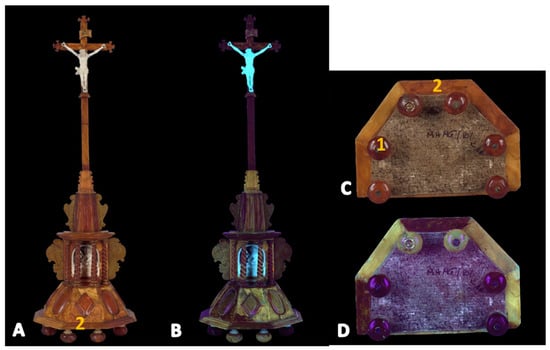 A similar situation is observed in the UV images of the crucifix (Figure 11). Images in visible light show a clear amber composition exhibiting different hues, while under UV, the object takes on completely different colors. This is most evident in the images of the base of the crucifix, where only two of the six legs are characterized by natural amber color under UV radiation.