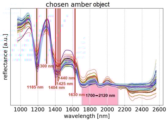 The authors are unaware of papers using the Golloch’s formula for these purposes. However, the values of the and coefficients have been reported for reference ambers [37]. The application of these values to the analysis of amber historical objects seems very promising. Comparison of the values of the coefficients determined for the object to the average values of the references makes it possible to obtain a map of the location of amber and places of doubtful identification (Figure 5A, Figure 7A, Figure 10A, and Figure 12A). The identification of amber is also supported by spectra collected from selected sites where the presence of amber was confirmed (Figure 13). The reflectance spectrum of amber shows the presence of characteristic absorption bands at about 1185 nm, 1425 nm (with the possibility of a double band of 1404 and 1440 nm), 1630 nm, a reflectance maximum at 1300 nm, and a characteristic shape of bands in the range of 1700–2120 nm associated mainly with the presence of CH and CH2 bonds and CH combination bands and O–H stretching vibration overtones [49,50,51,52].