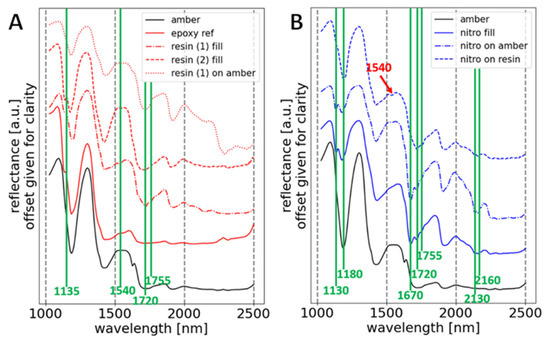 Selected RIS amber spectra in relation to identified imitations: (A) reference spectrum of epoxy resin, spectra of synthetic resin fillings, and a spectrum of synthetic resin on the amber surface; (B) spectrum of nitrocellulose filling, and a spectrum of nitrocellulose varnish on the amber surface and on the surface of the resin filling (recognized thanks to the presence of the 1540 nm band).