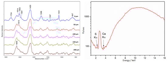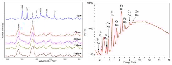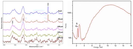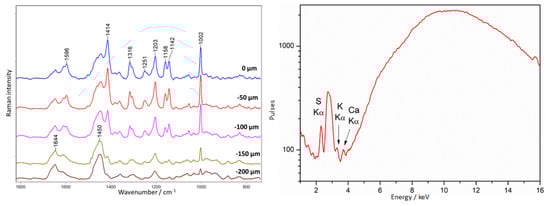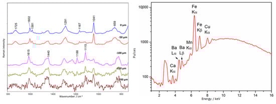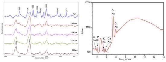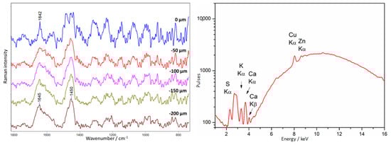 In the next step, the areas selected for microscopic analysis were selected based on the results of the macro studies. Raman spectroscopy and XRF spectrometry were used complementarily, as both have advantages and disadvantages. It should be noted that XRF measurements usually require less time than those taken using Raman spectroscopy. For example, one XRF measurement, which collects information through all sample layers, takes about a minute. In contrast, one depth profiling with a confocal Raman microscope (according to the parameters described in the present experiment) takes more than 8 min. However, with Raman spectroscopy, it is possible to define the measurement layer. Unfortunately, Raman spectroscopy is more sensitive to laser focus, surface characteristics, and impurities. Moreover, not all compounds in a sample give signals of comparable intensity, which can lead to misinterpretations. On the other hand, XRF is unsuitable for identifying the presence of organic compounds. This technique cannot identify both amber and organic compounds used for preservation (resins, varnishes). Pure amber consists exclusively of organic compounds, including elements such as carbon, oxygen, hydrogen, and sulfur, of which only sulfur is detectable by XRF spectroscopy [38]. Other elements, especially metals, indicate the presence of a layer of paint with a pigment or filler, such as chromium, barium, or titanium compounds, or identify cavity restorations in which the fillings used are colored or with the aforementioned pigments or form a plastic mass such as gypsum. Unfortunately, for substances that contain elements outside the XRF detection range, Raman spectroscopy remains the only means of identification. Moreover, the identification of organic compounds, especially polymers, by Raman spectroscopy is widespread, including in the field of heritage science [39,40,41,42].