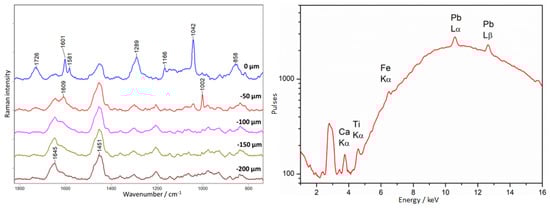 The varnish covering the ledge is characterized by an intense spectrum, despite the thin layer (from the −50 µm level, only pure amber is observed); the bands are very characteristic, and the amber spectrum is not observable in the first layer. Distinct bands are visible at 1595, 1527, 1451, 1399, 1339, 1255, and 1142 cm−1. Unfortunately, the substance could not be identified. Interestingly, in the form of an outer layer, it was identified on the object only here, while the column under the cross, which also has a purple color under UV radiation, was entirely filled with a secondary substance, containing the substance used to cover the cornice and mineral fillers.