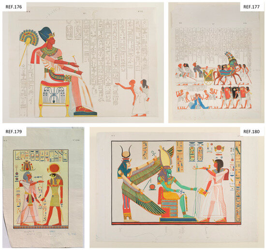 If the commercial publishers’ approach to producing replicas and disseminating them across a broad public was guided by interests other than historical curiosity, the same does not seem to be true for other personalities associated with academia and the art business. For instance, John Ruskin himself, who deliberately included Capurro’s prints in the collection he used to teach art at the University of Oxford, warned his students about the colours of these prints in the catalogue of the teaching collection and remarked: “Observe, respecting these plates of Rosellini, that the colours are in great part conjecturally restored—slight traces of the original pigments, and those changed by time, being interpreted often too arbitrarily […] The student, therefore, can only depend on these plates for the disposition of the colours, not for their qualities”. Ruskin’s frustrated comment suggests that he believed replicas of Egyptian paintings should have been painted with the same hues of colour used originally and, perhaps, with the same materials as much as possible. Nevertheless, he was aware that this was no easy task to accomplish. In the passage quoted above, he went on to say: “The beauty or vulgarity of any given colour, much more that of its harmony with others, is determined by delicacies of hue which no restorer can be secure of obtaining, and few attempt to obtain” [42] (vol. 21, pp. 44–45).