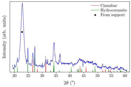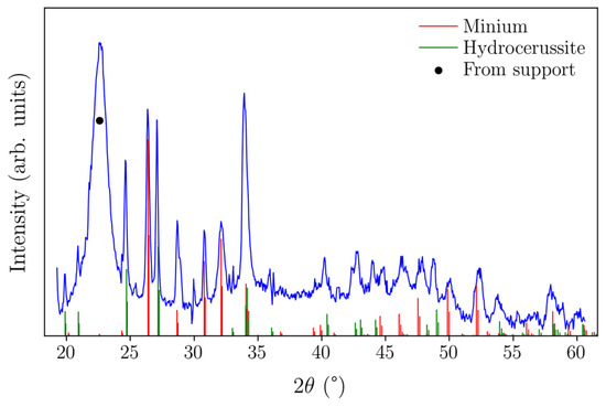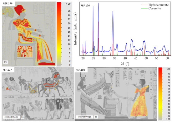 Figure 1 shows the hand-coloured engravings investigated during this study, predominantly painted in red, yellow, and blue. They are replicas of frescoes found in different parts of Egypt, with the following represented in particular: Ramesses II receiving Suppliants (WA.RS.REF.176) and the Chariot of Ramesses II (WA.RS.REF.177), both from the depiction of the Battle of Qadesh in the Great Hall of the Temple at Abu Simbel; Merneptah adoring Re-Harakhti (WA.RS.REF.179); and Ramesses III adoring Isis and Ptah-Sokar (WA.RS.REF.180), from the tombs in the Valley of the Kings. The material analyses showed that the outline of all the engravings was printed with black ink that lacked an XRF fingerprint, probably carbon ink. Furthermore, red ink was used in REF.179 and 180 and was found to be rich in lead. XRD further clarified the pigments’ composition, showing that the red areas were printed with a mixture of lead-based pigments. Figure 2 shows the XRD diffractogram obtained for REF.179; the measured peaks matched the pattern for minium and hydrocerussite. The broad maximum at about 23° 2θ corresponded to cellulose in the paper/cardboard support (Figure S1) and was visible on most diffractograms, except where the increased X-ray absorption of specific pigments likely prevented its appearance.