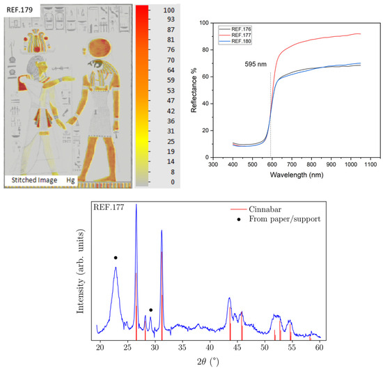 The red hand-painted areas were found to be rich in mercury on all engravings, as revealed by MA-XRF elemental maps. XRD and FORS confirmed the presence of vermilion on all of the prints. Figure 4 shows the elemental map of mercury obtained on REF.179, together with the FORS spectra obtained on the red areas of REF.176, 177, and 180. Their sigmoid shape and the inflection point around 600 nm were consistent with vermilion [43,44]. Finally, the XRD diffractogram in Figure 4, measured on a red area in REF.177, matches the pattern of cinnabar.