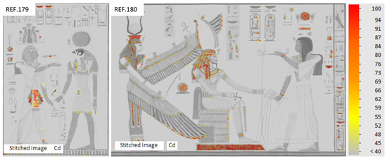 The absence of an XRF fingerprint in most yellow areas revealed that they were painted with an organic colourant, which could not be further characterised by the analytical protocol employed during this investigation. However, in a few restricted regions, MA-XRF and XRD detected the use of cadmium yellow, chrome yellow, and lemon yellow (strontium chromate). Figure 5 shows MA-XRF elemental maps for cadmium in REF.179 and REF.180. In both cases, the comparison of these maps with the images of the prints in Figure 1 showed that cadmium correlated with yellow and red areas, such as Merneptah’s yellow skirt in REF.179 and the red hieroglyph on the top right in REF.180, as well as blue areas, such as the blue hieroglyphs in REF.179 and the base of the throne in REF.180, suggesting pigment mixtures.