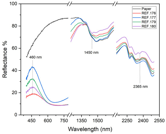 In most of the blue areas, Prussian blue was identified using FORS. Figure 7 shows the reflectance spectra acquired for the blue areas of REF.176, 177, 179, and 180. All the reflectance spectra showed the characteristic shape of this pigment, with a maximum in the visible region between 450 and 475 nm, depending on the concentration of the pigment [45]. Further absorption bands in the NIR region between 2360 and 2370 nm, associated with the combination of IR stretching and Raman modes for the nitrile functional group, were visible in the spectra acquired on REF.176, 177, and 180 [46,47]. Furthermore, all the spectra displayed a band at 1450 nm assigned to the first overtone of OH stretching for lead white [48].