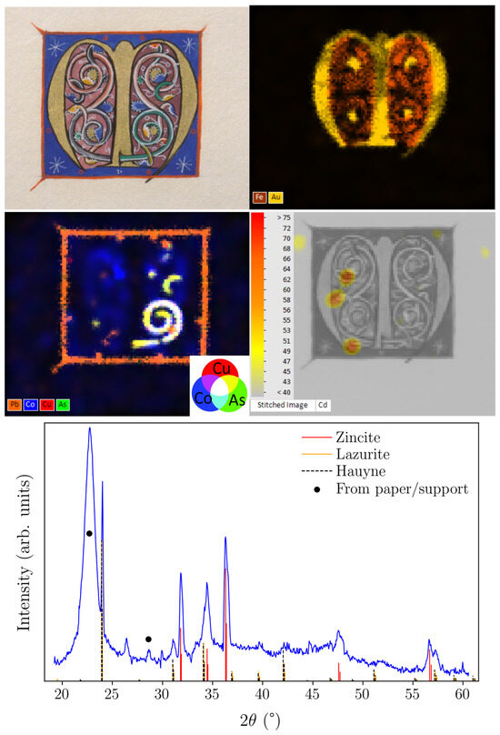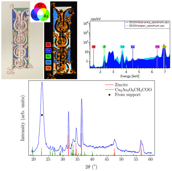 In contrast, ED.206, depicting the initials “M” and “E”, was painted with a different set of pigments. XRF revealed that the golden areas were laid using a pure gold pigment or foil. Figure 10 (top) shows the spatial distribution of gold and iron across the initial M. The distribution of iron suggests the use of ochres in the red areas, which was confirmed by FORS. Furthermore, the spatial distribution of lead in Figure 10 (middle-left) suggests that minium was used for the thin-shaped outline, while the presence of cobalt (blue), copper (red), and arsenic (green) correlates with the green spiral decoration, which appears white in the elemental map and suggests that a mixture of emerald green and cobalt blue was used. This particular pigment mixture has been reported during previous technical studies of Victorian paintings [27,41]. Furthermore, the distribution of cadmium shown in Figure 10 (middle-right) indicates the use of cadmium yellow in a few restricted areas. Finally, the XRD analysis showed that the blue areas of the background around the letters were painted with ultramarine blue, as shown in the diffractogram in Figure 10 (bottom). The absence of phases such as calcite, wollastonite, diopside, and quartz suggests the use of synthetic ultramarine rather than natural. Furthermore, the diffractogram shows that zinc oxide was mixed with ultramarine. In fact, both XRF and XRD indicated that zinc white was mixed in most pigments.