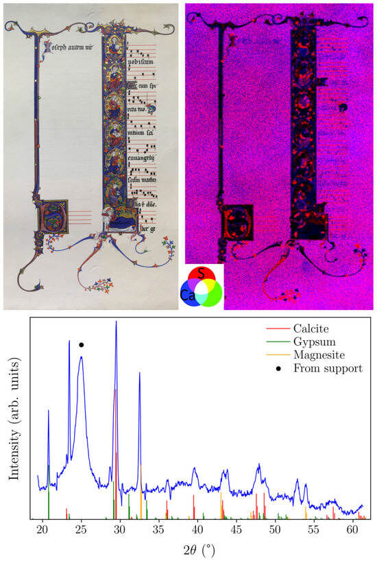 Top: visible image (left) and macro-XRF maps (right) of sulphur (red) and calcium (blue) obtained for WA.RS.ED.207. Bottom: X-ray diffractogram of blank paper on a cardboard frame. Owing to the layer structure of the sample, the peaks from the different phases experienced different shifts, which was especially visible for magnesite.