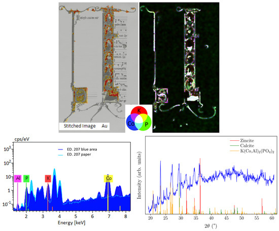Regarding the pigments, the two watercolours are dominated by blue, gold, and red tones. Figure 12 (top left) shows the spatial distribution of gold across ED.207, indicating that gold foil or shell gold was used for the golden details. Furthermore, macro-XRF revealed that the blue areas are characterised by a complex elemental composition. Figure 12 (top right) shows the elemental maps of potassium (red), cobalt (blue), and phosphorous (green) on ED.207. All these elements are contained in the blue colour used for the illumination, which appears white in the elemental map. Furthermore, these blue areas also contain aluminium, as shown by the XRF spectrum in Figure 12 (bottom left). XRD analyses on these areas retrieved a diffractogram partially matching a mixed phosphate containing potassium, aluminium, and cobalt, with the formula K(Co,Al)2(PO4)2 and a monoclinic crystal structure. This blue pigment, whose composition is significantly different than the cobalt-containing ground glass used historically, was previously found in John Ruskin’s watercolours and was marketed as “smalt” by Winsor and Newton, as revealed by the material characterisation of colour books from the early 20th century conducted at the State Research Institute for Restoration in Moscow [27,49]. Gold and “smalt” also dominate the colour palette in ED.208.