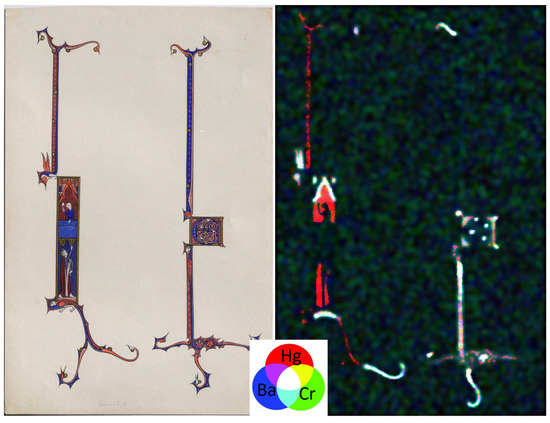 Visible image and macro-XRF map of mercury (red), barium (blue), and chromium (green) obtained on WA.RS.ED.208.