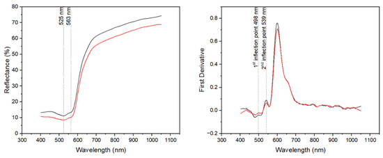Reflectance spectra (left) and first derivative transformation (right) of two red areas on WA.RS.ED.207.
