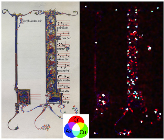 Figure 9 (top right) shows the elemental maps for chromium, copper, arsenic, cobalt, and mercury on ED.204. The elemental distribution of mercury indicated that the outline of the letter was traced with vermilion, as was the case for ED.205. The use of vermilion was confirmed via XRD on both initials. Furthermore, the elemental maps in Figure 9 show that the green areas in ED.204 contain copper, arsenic, and chromium. The XRD analysis further characterised the composition of this green area and retrieved a pattern that matched emerald green (copper acetoarsenite, Figure 9, bottom), which was likely mixed with a chromium base green pigment. In contrast, chromium-based pigments were not found in the green areas of ED.205, which was painted solely with emerald green. Finally, the distribution of cobalt in the elemental map of ED.204 suggests that cobalt blue (cobalt aluminate) was used for the light blue areas. The presence of aluminium was confirmed via a 1 min XRF spot measurement (Figure 9, top right). The same blue pigment was used for the blue areas in ED.205.