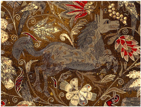 The cartouches are surrounded by imaginary landscapes populated with courtly figures and rural laborers in late sixteenth-century European dress engaged in all manner of courtly festivities and rural activities, including farming, hunts, and combats. The compulsion to leave no space undecorated in horror vacui, a characteristic of Spanish American seventeenth-century decorative arts, is epitomized by early Peribán lacquerware. A fantastic menagerie of domestic animals, wildlife, and mythical creatures inhabit the scenes—dragons, unicorns, deer, wild boar, eagles, and lions—as well as the occasional New World species, such as the armadillo seen at the top center in the detail of the ca. 1625 batea (Figure 31). Dutch and Flemish prints served as the primary source for these images, yet the creativity of the Indigenous artists in their interpretation of European models remains omnipresent.