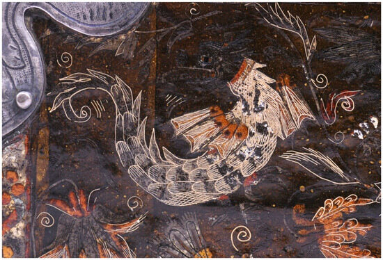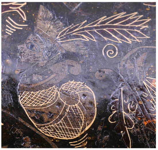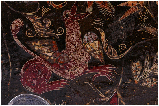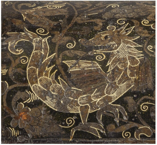 In general, there is a common evolutionary trait within the decorative arts in viceregal Latin America in which the earliest pieces exhibit the greatest complexity and attention to detail. In the case of barniz brillante, this is evidenced in the complex patterns created by overlaying minute colored design elements, such as small squares, triangles, and circles, on individual figures. The same applies to the outlining, cross-hatching, and spirals used to reinforce parts of figures and create shading or create complex patterns using fine strands of black or white mopa mopa, as seen earlier in the undulating lines and spirals on the body of the griffin on the casket LS2067 (Figure 4). Based on the visual examination criteria discussed within a range of 1625–1650, The Hispanic Society of America casket (LS2067) would be the earliest, and the Victoria and Albert’s would be the latest.