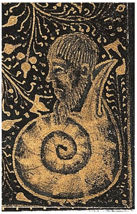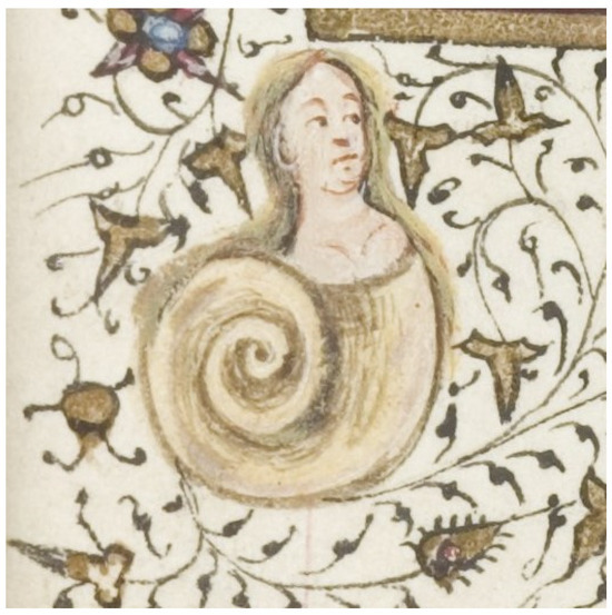 Some Indigenous influences appear on early barniz de Pasto, both matte and brillante, yet Asian influences are largely absent in spite of the fact that Asian lacquers served as the inspiration for the viceregal lacquers. This was probably due to the fact that the Indigenous artisans did not have specimens of the valuable Asian ware for reference at that early date. Most of the early designs were derived from fifteenth- and sixteenth-century European sources, such as illuminated manuscripts, emblem books, prints, and drawings, that were provided by Catholic missionaries to the Indigenous artisans with the idea of applying the Indigenous lacquer techniques to decorative objects that could compete with Asian lacquerwares. The Indigenous artisans often chose to interpret these foreign images within their own cultural heritage, like the snailperson on the Hispanic Society casket (Figure 5), who is depicted with a crown of feathers3 typical of a Kamëntsa shaman of the Sibundoy Valley [18], being the same location from which mopa mopa was sourced for the artisans in Pasto. Snailpersons do not appear in contemporary European printed books or prints, so the images adapted by the artisans in Pasto originated from late fifteenth- or early sixteenth-century illuminated manuscripts, similar to the French and Belgian examples seen here from Late Medieval manuscripts in the collection of the Department of Manuscripts and Rare Books at The Hispanic Society of America (Figure 6 and Figure 7).