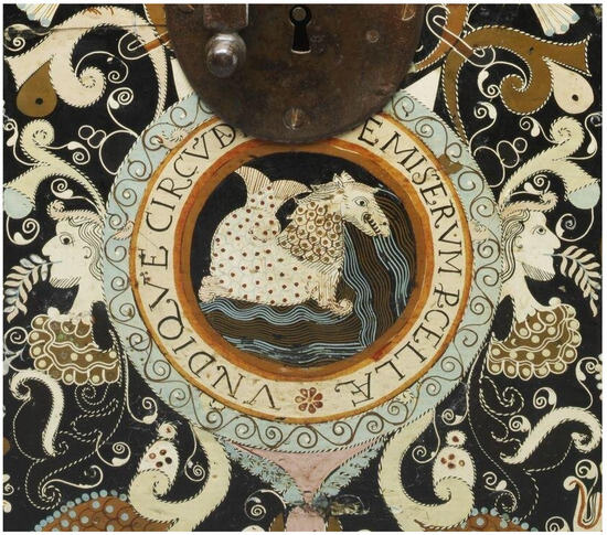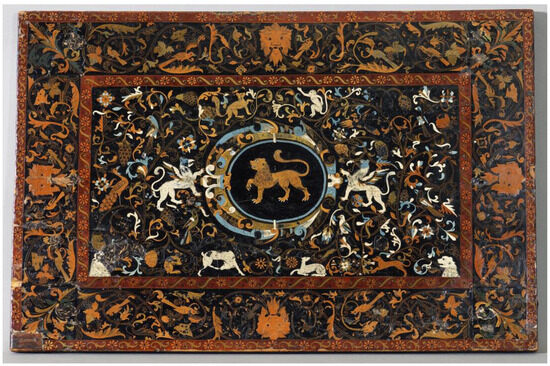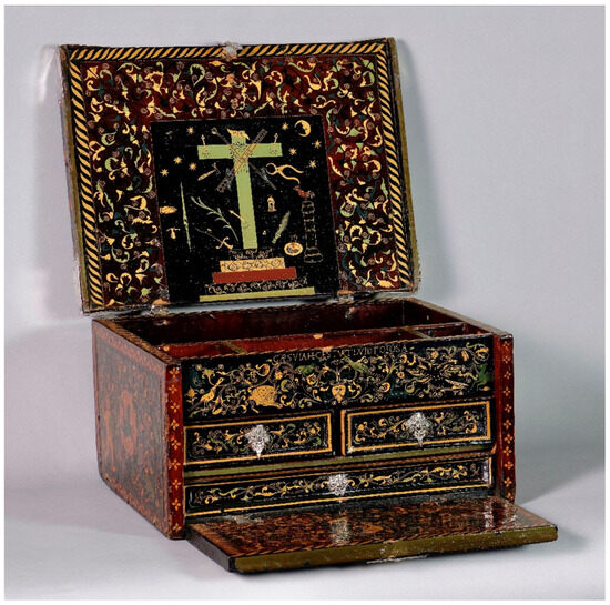 A matte barniz de Pasto table cabinet4 and accompanying tabletop5, acquired in 2019 by The Hispanic Society of America, display equally diverse imagery drawn from Classical mythology, Renaissance, Mannerist, and Indigenous sources (Figure 8, Figure 9 and Figure 10). The decorative surfaces are populated with Indigenous and Spanish hunters, dogs, wild boars, armadillos, deer, monkeys, birds, rabbits, jaguars, and lions, intermingled with mythological beasts such as satyrs, griffins, and unicorns, along with Mannerist cartouches and grotesque masks, all surrounded by Renaissance foliate and floral rinceaux. Symbols of the Stations of the Cross depicted on the interior of the lid suggest that the table cabinet was made for a member of the clergy (Figure 8 and Figure 10).