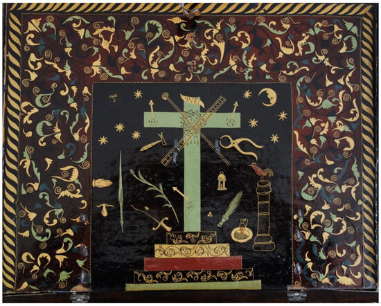 Colombian and Spanish archival sources reveal that Martín de Tolosa was a cleric, priest, chief sacristan, and chapel master of the Cathedral of Popayán from at least 1630 to 1643 [19,20,21,22]. Based on this documentation, the table cabinet and tabletop are the earliest known datable examples of seventeenth-century barniz de Pasto based on provenance.