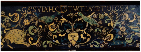 This table cabinet represents the only known example of the incorporation of an owner’s name as part of the original surface design on any piece of seventeenth-century barniz de Pasto. The ownership inscription appears on the interior front panel above the drawers, which reads in Latin: CAPSULA H(A)EC EST MARTINI DE TOLOSA; in English translation: THIS IS THE BOX OF MARTIN DE TOLOSA (Figure 12). Fortunately, it has been possible to identify the owner and accordingly provide an approximate date for the writing cabinet and tabletop.